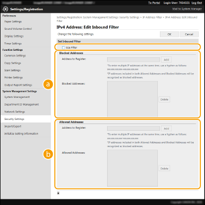 If IP addresses are incorrectly entered, you may be unable to access the machine from the Remote UI, in which case you need to set <IPv4 Address Filter> or <IPv6 Address Filter> to <Off>. IPv4 Address Filter IPv6 Address Filter