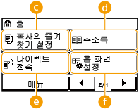 를 누르면 <홈> 화면이 표시됩니다. 설정 및 등록 기능을 지정하려면 이 화면을 사용하십시오.