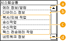 남은 용지 또는 토너 잔량과 같은 기기의 상태를 표시합니다.