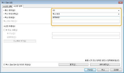 [수신인 이름]/[통신 모드]/[팩스 번호/URI]/[팩스 번호]를 지정하고 [확인]을 클릭합니다.