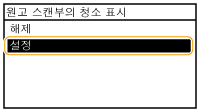 스캔 영역에서 감지된 불순물에 대한 메시지를 표시하려면 <원고 스캔부의 청소 표시>를 <설정>으로 설정하십시오.
