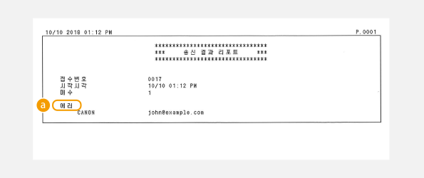 이메일의 경우 이메일/파일 송신 결과 리포트는 기기와 수신인 주소 간의 전송 결과가 아니라 기기와 메일 서버 간의 전송 결과를 나타냅니다. 전송이 실패하더라도 3자리 에러 코드가 인쇄되지 않습니다. 에러 코드를 확인하려면 통신 관리 리포트(
