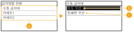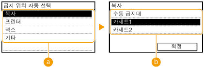 ). 수동 급지대에서 급지되는 용지에 인쇄하는 경우 자동 카세트 선택이 항상 활성화됩니다.