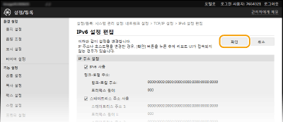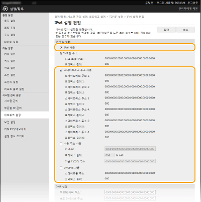 리모트 UI를 통해 기기의 IPv6 주소를 구성할 수 있습니다. IPv6 주소를 설정하기 전에 IPv4 주소 설정을 확인하십시오(IPv4 설정 표시). IPv6 주소를 사용하려면 정확한 IPv4 설정을 설정해야 합니다. 스캐너 드라이버 또는 MF Scan Utility를 사용하는 스캔 기능은 IPv6 환경에서 사용할 수 없다는 점에 유의하십시오. 본 기기는 다음 IPv6 주소 중에서 최대 9개의 주소를 사용할 수 있습니다.