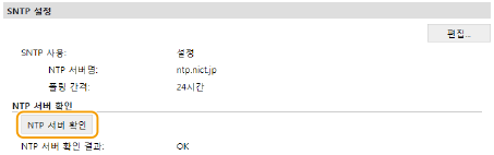 [네트워크 설정] [TCP/IP 설정]을 클릭하고 다음에 나타나는 [SNTP 설정]에서 [NTP 서버 확인]을 클릭하면 등록한 서버와의 통신 상태를 볼 수 있습니다. 연결이 제대로 설정되면 아래와 같이 결과가 표시됩니다. 이 작업을 수행하여도 시스템 시계는 조정되지 않습니다.![]() |