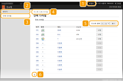 주소록에 등록된 단축 다이얼 번호 목록을 표시합니다. 시스템 관리자 모드로 로그온하면 주소록을 등록하거나 편집할 수도 있습니다.
