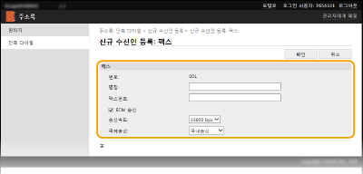 팩스 설정)에서 [ECM 송신] 및 [송신속도]를 지정할 수도 있습니다. 그러나 주소록에 등록된 수신인의 세부 설정의 경우 <주소록>에서 지정한 설정이 활성화됩니다.