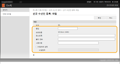 컴퓨터를 사용하여 기기의 주소록을 등록하거나 편집할 수 있습니다. 공유 폴더 수신인을 여기에 지정하십시오.