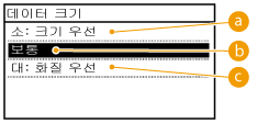 스캔한 문서를 JPEG 형식으로 변환할 때 파일 압축 비율을 지정할 수 있습니다. <소: 크기 우선>을 선택하면 압축률을 평소보다 높여, 이미지 품질이 더 낮은 더 작은 크기의 파일이 생성됩니다. 반면, <대: 화질 우선>을 선택하면 압축률이 보통보다 줄어들어 이미지 품질이 높아집니다.