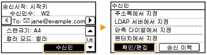 사무실에 LDAP 서버가 설치된 경우 서버의 정보를 사용하여 수신인을 지정할 수 있습니다. 기기를 통해 LDAP 서버에 액세스한 다음 해당 사용자 정보를 검색하고 그 사용자를 수신인으로 지정합니다.
