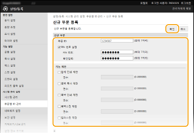 부서 ID에 대해 최대 7자리의 숫자를 입력합니다. [PIN 번호 설정]