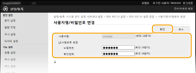비밀번호를 설정하거나 변경하려면 확인란을 선택하고 [비밀번호] 및 [확인입력] 텍스트 상자에 새 비밀번호로 최대 24자의 영숫자 문자를 입력합니다. |