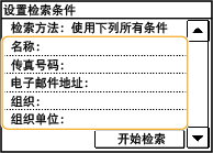 3 | 选择搜索用户信息的条件。 姓名、传真号码、电子邮件地址、组织名称及组织单位均可用作搜索接收方的条件。 ![]() |