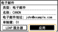 9 | 轻触 <应用>。 对于在所选用户的 LDAP 服务器上注册的用户名和电子邮件地址,将在地址簿中进行注册。 |
