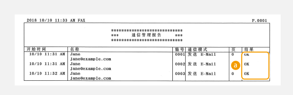 针对每个错误代码的应对措施)。对于电子邮件,通信管理报告上显示本机和邮件服务器之间的传送结果,而不是本机和接收方地址之间的传送结果。