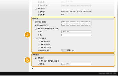 2 | 配置 IPv4 DNS 设置。 ![]() [DNS设置][主DNS服务器地址] 输入 DNS 服务器的 IP 地址。 [辅助DNS服务器地址] 如果有辅助 DNS 服务器,请输入其 IP 地址。 [主机名] 为要注册到 DNS 服务器的本机主机名输入最多 47 个字母数字字符。 [域名] 为本机所属的域名输入最多 47 个字母数字字符,例如“example.com”。 [DNS动态更新] 选择该复选框可在本机的 IP 地址更改时动态更新 DNS 记录。指定更新间隔时,请在 [DNS动态更新间隔] 文本框中以小时为单位输入时间。 [mDNS设置][使用mDNS] mDNS(多路传送 DNS)是不通过 DNS 将主机名与 IP 地址相关联的协议,Bonjour 采用的就是该协议。选择此复选框启用 mDNS,然后在 [mDNS名称] 文本框中输入 mDNS 名称。 [DHCP选项设置][获取主机名] 选择此复选框可启用选项 12,以 从 DHCP 服务器获得主机名。 [DNS动态更新] 选择此复选框可启用选项 81,以 通过 DHCP 服务器动态更新 DNS 记录。 [获取SMTP服务器地址] * 选中此复选框可启用选项 69 从 DHCP 服务器获得 SMTP 服务器地址。 *对 imageRUNNER 2206AD / 2206N 而言是可选的 [获取POP服务器地址] * 选中此复选框可启用选项 70 从 DHCP 服务器获得 POP3 服务器地址。 *对 imageRUNNER 2206AD / 2206N 而言是可选的 |