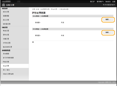 检查是否有输入错误。如果错误输入 IP 地址,则可能无法从远程用户界面访问本机,此时需要将 <IPv4地址筛选器> 或 <IPv6地址筛选器> 设置为 <关闭>。 IPv4地址筛选器 IPv6地址筛选器  IP 地址输入形式 | 说明 | 示例 | 输入单个地址 | IPv4: 用点分割数字。 | 192.168.0.10 | IPv6: 用冒号分割字母数字字符。 | fe80::10 | 指定地址范围 | 在地址之间插入连字符。 | IPv4: 192.168.0.10-192.168.0.20 | IPv6: fe80::10-fe80::20 | 指定具有前缀的地址范围(仅限 IPv6) | 输入地址,然后输入斜杠和表示前缀长度的数字。 | fe80::1234/64 |