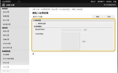 2 | 指定地址。 在 [要注册的地址] 文本框中输入 MAC 地址并单击 [添加]。仅允许通过已注册 MAC 地址的设备通信(接收)并限制与具有任何其他 MAC 地址的设备通信。 无需用连字符或冒号分割地址。 ![]() 检查是否有输入错误。 如果错误输入 MAC 地址,则可能无法从远程用户界面访问本机,此时需要将 <MAC地址筛选器> 设置为 <关闭>。 MAC地址筛选器 ![]() 从例外中删除 MAC 地址 选择一个 MAC 地址,然后单击 [删除]。 ![]() |