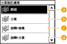 準備多份多頁文件時,您可將影印紙張的順序設為 <群組>、<分套>、<旋轉+檢集> 或 <旋轉+分套>。準備會議或簡報講義時,本功能非常實用。