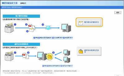 傳送功能設定工具 可協助您指定傳送電子郵件的基本設定。不使用 傳送功能設定工具 的話,您可以使用遠端使用者介面來指定更多詳細設定,例如傳送前 POP 認證設定或加密通訊設定。指定電子郵件通訊設定