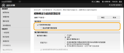使用授權傳送登入畫面中輸入的使用者名稱與密碼在伺服器上執行認證。勾選 [顯示認證螢幕] 核取方塊會顯示您傳送資料時已輸入的使用者名稱與密碼的認證畫面。