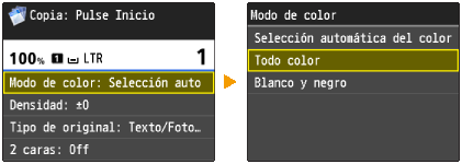 Puede cambiar diversas opciones relacionadas con la pantalla, como la velocidad de desplazamiento o el idioma: Tiempo para reinicio automático Para cambiar la pantalla que aparece automáticamente cuando el equipo permanece inactivo durante un periodo de tiempo especificado: Función tras reinicio automát. |