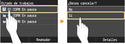 <Trabajos de copia/impresión>   <Estado de trabajos>   Pulse el documento de copia en la pantalla <Estado trabajos copia/impresión>   <Cancelar>  <Sí>