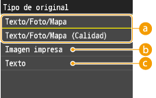 | | Puede seleccionar la calidad de imagen óptima para la copia en función del tipo de documento, como por ejemplo documentos de solo texto, documentos con tablas y gráficos o fotos de revistas. |