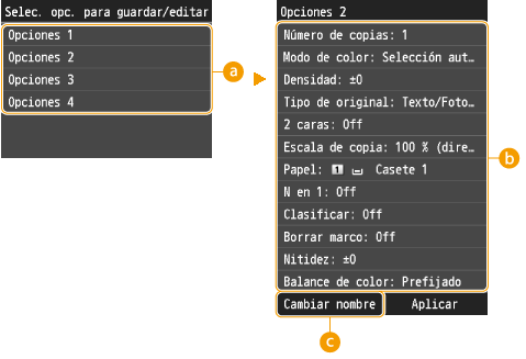 Puede registrar hasta cuatro combinaciones de opciones de copia que utilice con frecuencia. Seleccionando simplemente una combinación de opciones registradas cuando sea necesario, podrá eliminar la necesidad de configurar las mismas opciones cada vez que realice copias, por ejemplo, si establece el número de copias en 5 con frecuencia, ajuste <Borrar marco> en <On>, y aumente la nitidez cuando realice copias. Puede registrar las combinaciones de opciones con cualquier nombre.