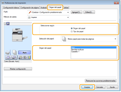 ![]() | Para imprimir en el papel especificado, indique el origen del papel cargado con el papel que desea utilizar. |