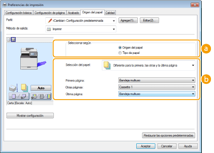 Puede imprimir páginas específicas de un documento, como por ejemplo, si desea imprimir la portada de un cuadernillo en papel a color. En este caso, cargue papel a color para la portada en la bandeja multiuso, cargue papel normal para las páginas del cuerpo en el casete de papel y, a continuación, especifique las opciones de papel en el controlador de impresora. ![]() [Seleccionar según]Como en el ejemplo que se describe anteriormente, para utilizar papel específico en páginas específicas, seleccione [Origen del papel]. [Selección del papel]Seleccione cómo especificar papel, como [Diferente para la portada y las otras páginas]* o [Diferente para la primera, las otras y la última página]. Asimismo, especifique qué papel debe utilizarse en la portada y las páginas del cuerpo.