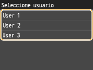 Si aparece la pantalla <Seleccione usuario>Si se conservan en la memoria documentos protegidos de dos o más usuarios, aparecerá la pantalla <Seleccione usuario> antes que la pantalla <Seleccionar archivo>. Pulse su nombre de usuario.