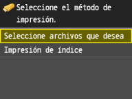 Impresión de ÍndicePuede imprimir miniaturas de los archivos de imágenes (solo JPEG) almacenados en un dispositivo de memoria USB. Para imprimir las imágenes como miniaturas, pulse <Impresión de índice> en la pantalla anterior, y continúe con el siguiente paso.
