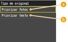 Puede seleccionar el tipo de original en función de la imagen que desee imprimir. Pulse <Priorizar fotos> o <Priorizar texto>.