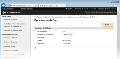 Puede registrar la información, incluido el nombre del equipo y la ubicación de instalación, que se utilice para identificar el equipo. Asimismo, puede deshabilitar la función AirPrint del equipo. Utilice la IU remota para cambiar estas opciones.