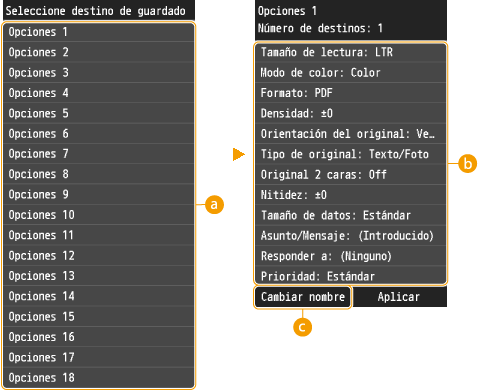 Si desea eliminar una opción registrada, pulse <Lectura> <Opciones favoritas> <Editar/Elimin.> <Eliminar> pulse las opciones que desea editar <Sí>.Si desea utilizar una opción registrada, pulse <Lectura> <Opciones favoritas> pulse la opción.Las opciones registradas se guardan incluso cuando el equipo está apagado. Puede cambiar las opciones detalladas de una opción utilizada con frecuencia según sea necesario después de seleccionarla. |
