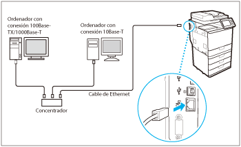 Conecte el equipo a un ordenador a través de un router. Utilice un cable de red para conectar el equipo al router.