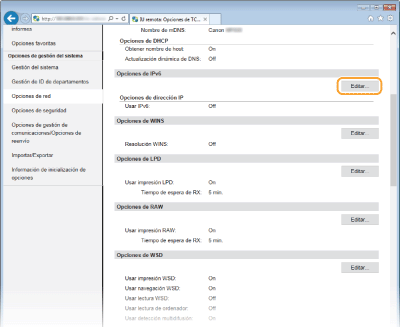 Comprobación de las opciones correctasAsegúrese de que la pantalla de la IU remota pueda mostrarse en el ordenador utilizando la dirección IPv6 del equipo. Inicio de la IU remota Uso del panel de controlTambién es posible acceder a las opciones de IPv6 desde <Menú>. Opciones de IPv6 |
