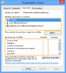 2 | Seleccione los usuarios o grupos a los que desea dar acceso a la carpeta compartida haga clic en [Agregar]/[Editar] en la lista para configurar los permisos de acceso, establezca [Permitir] para los permisos de acceso [Escritura] y [Lectura y ejecución] o superior.![]() Para los datos en la carpeta, marque [Permitir] tanto en [Escritura] como en [Lectura] o una autoridad de acceso superior. ![]() En el entorno de Active Directory, los procedimientos para especificar las opciones de seguridad de la carpeta compartida difieren de lo anterior. Para obtener más información, consulte el manual de Windows. |