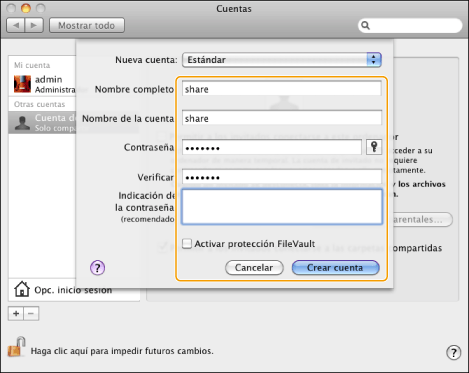 2 | En la ventana [Cuentas], introduzca el nombre del usuario a quien desea enviar los datos desde el equipo a través de Mac OS X introduzca la contraseña.![]() |