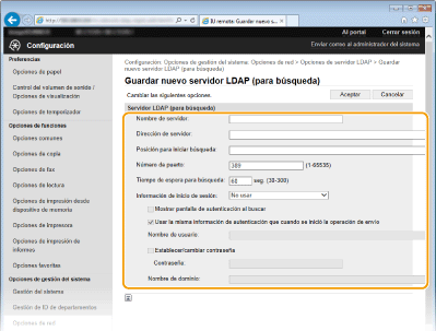 | | Si se implementa un servidor LDAP en la red, puede buscar números de fax y direcciones de e-mail en el servidor y, a continuación, especificarlos como destinos o registrarlos en la libreta de direcciones. Puede registrar un máximo de cinco servidores LDAP en el equipo. Registre servidores LDAP a través de la IU remota. |