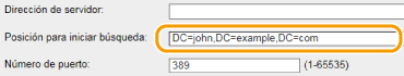 Al especificar el nodo, introduzca "DC=", seguido de un nombre de host (cadena de caracteres delimitados por puntos en el nombre de dominio de Active Directory), y separe cada una de las entradas con una coma. Si el nombre de dominio es "john.ejemplo.com", por ejemplo, introduzca "DC=john,DC=ejemplo,DC=com."