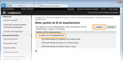 Seleccione la casilla de verificación [Gestión de ID de departamentos] y haga clic en [Aceptar].
