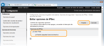Puede activar o desactivar la comunicación IPSec en <Menú>. Usar IPSec |