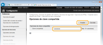 2 | Introduzca hasta 24 caracteres alfanuméricos para la clave precompartida y haga clic en [Aceptar]. |