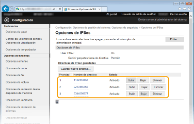 Las directivas se aplican desde la que se encuentra en la posición más elevada hasta la que se encuentra en la posición más baja. Haga clic en [Subir] o [Bajar] para subir o bajar una directiva.