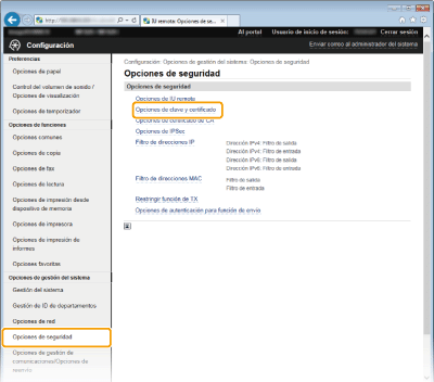 Los pares de claves pueden generarse con el equipo en caso necesario para la comunicación cifrada a través de Seguridad de capa de transporte (Transport Layer Security, TLS). Puede utilizar TLS para acceder al equipo a través de la IU remota. Pueden registrarse hasta cinco pares de claves en el equipo.