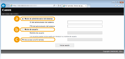 [Modo de administrador del sistema]Puede realizar todas las operaciones y configuraciones de la IU remota. Introduzca el ID adecuado en [ID de administrador del sistema] y el PIN en [PIN admdor. sistema] (