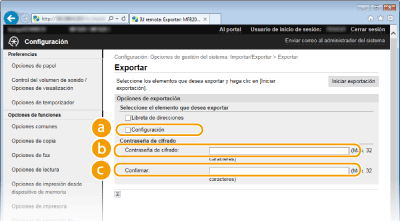 La configuración no puede importarse/exportarseConfiguración | Ubicación | <Ajustes de fecha/hora actuales> | <Menú>  <Opciones de temporizador>  <Ajustes de fecha/hora> | <Guía de configuración de fax> | <Menú>  <Opciones de fax> | [Opciones de usuario 1]/[Opciones de usuario 2]/[Opciones de usuario 3] | [Configuración]  [Opciones de red]  [Opciones de SNMP]  [Opciones de SNMPv3] | [Opciones de contexto] | [Total de páginas por ID de departamento] | [Configuración]  [Gestión de ID de departamentos] | [Opciones de clave y certificado] | [Configuración]  [Opciones de seguridad] | [Opciones de certificado de CA] | <Inicializar tras cambiar piezas> | <Menú>  <Ajuste/Mantenimiento> | <Seleccionar país/región> | <Menú>  <Opciones de gestión del sistema> | <Opciones de reenvío> | <Opciones de IU remota> | <Importar/exportar opciones> | <Registrar licencia> | <Actualizar firmware> | <Inicializar clave y certificado> | <Inicializar libreta de direcciones> | <Inicializar menú> | <Archivar documento TX> | <Menú>  <Opciones de gestión del sistema>  <Opciones de gestión de comunicaciones>  <Opciones de fax> |