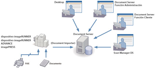 imageWARE Document Server es un servidor de gestión de documentos que utiliza Función Cliente de imageWARE Document Server o imageRUNNER ADVANCE Desktop como cliente. Además de los documentos creados con estos clientes, también puede guardar documentos escaneados a través de la red como, por ejemplo, desde la Serie imageRUNNER de dispositivos multifunción digitales y la serie DR de lectura de documentos. Esto permite crear un sistema de gestión de documentos altamente funcional para administrar eficazmente los documentos guardados.